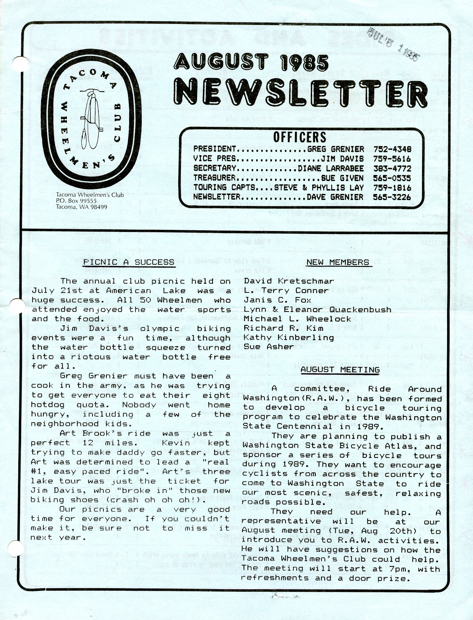 August 1985 Newsletter